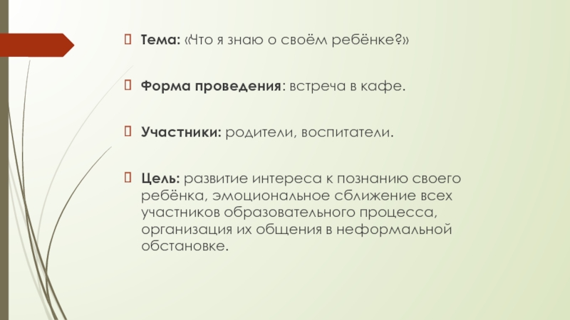 Цель: развитие интереса к познанию своего ребёнка, эмоциональное сближение всех участников образовательного процесса, организация их общения в неформальной обстановке.