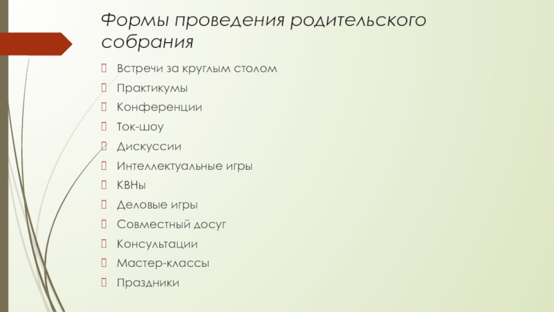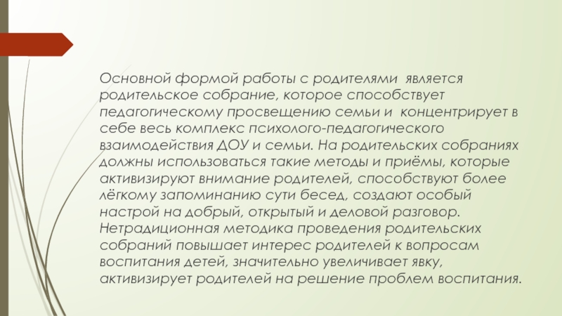 просвещению семьи и концентрирует в себе весь комплекс психолого-педагогического взаимодействия ДОУ и семьи. На родительских собраниях должны использоваться такие методы и приёмы, которые активизируют внимание родителей, способствуют более лёгкому запоминанию сути бесед, создают особый настрой на добрый, открытый и деловой разговор. Нетрадиционная методика проведения родительских собраний повышает интерес родителей к вопросам воспитания детей, значительно увеличивает явку, активизирует родителей на решение проблем воспитания.