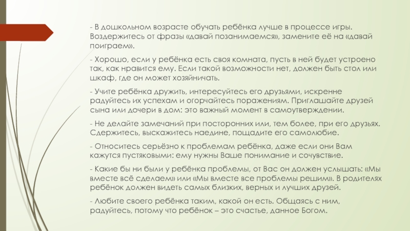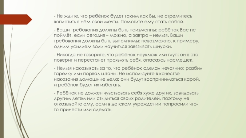 Слайд 11- Не ждите, что ребёнок будет таким как Вы, не стремитесь