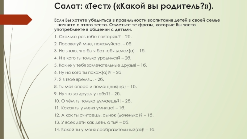 Слайд 15Салат: «Тест» («Какой вы родитель?»).