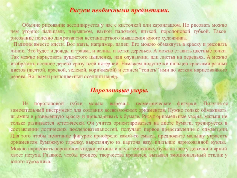 карандашом. Но рисовать можно чем угодно: пальцами, перышком, ватной палочкой, ниткой, поролоновой губкой. Такое рисование полезно для развития нестандартного мышления юного художника.