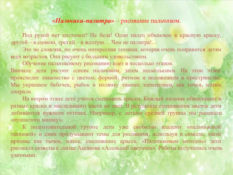 К подготовительной группе дети уже свободно владеют «пальчиковой техникой» и сами придумывают темы для рисования, используя в сюжете, такие приемы как тычок, мазок, смешивание красок. «Пальчиковым методом» дети рисовали сюжеты к сказке Аксакова «Аленький цветочек». Работы получились очень удачными.