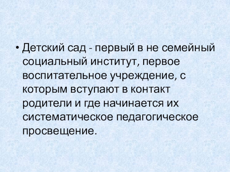 учреждение, с которым вступают в контакт родители и где начинается их систематическое педагогическое просвещение.