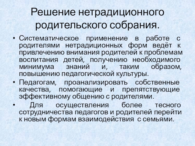 Систематическое применение в работе с родителями нетрадиционных форм
