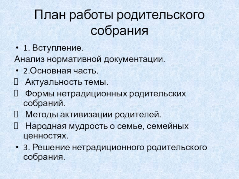Слайд 3План работы родительского собрания