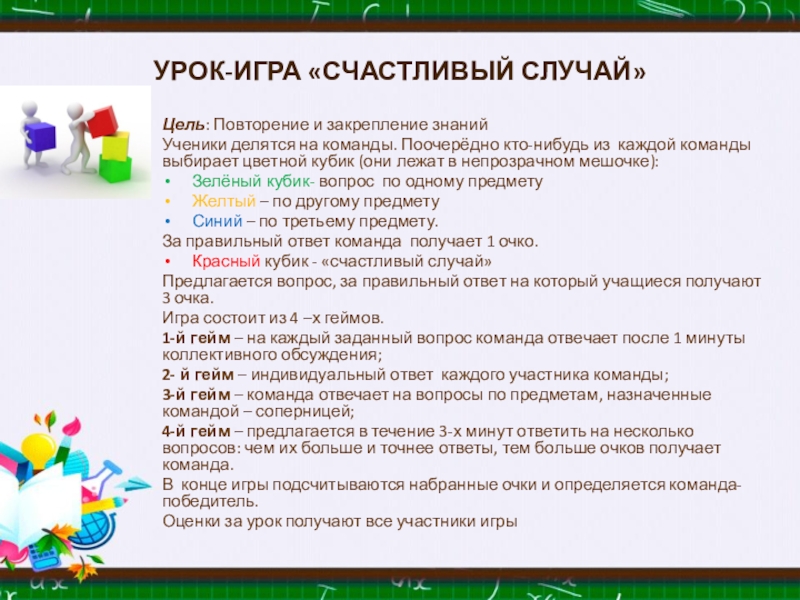 каждой команды выбирает цветной кубик (они лежат в непрозрачном мешочке):