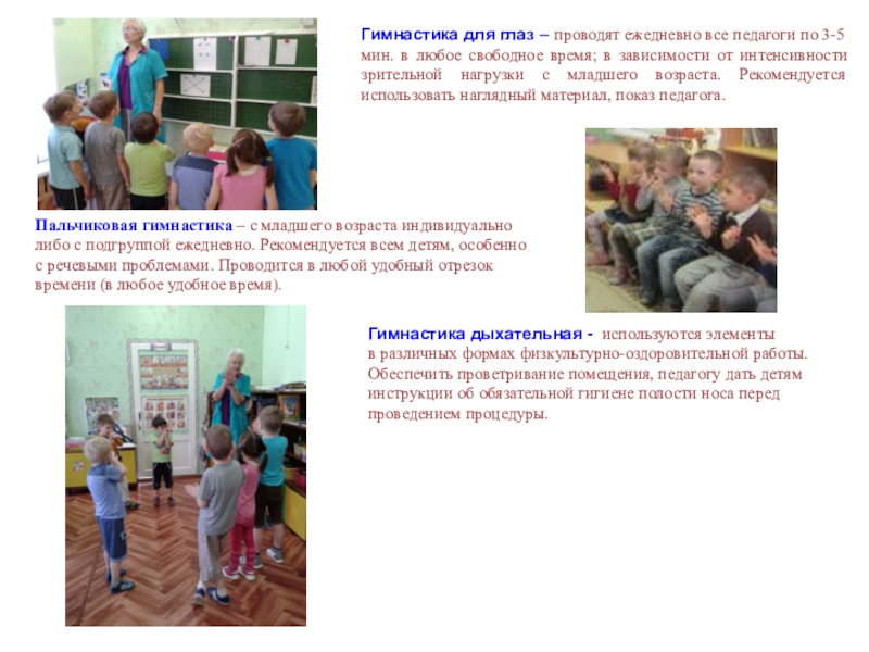 Гимнастика дыхательная - используются элементы в различных формах физкультурно-оздоровительной работы. Обеспечить проветривание помещения, педагогу дать детям инструкции об обязательной гигиене полости носа перед проведением процедуры.