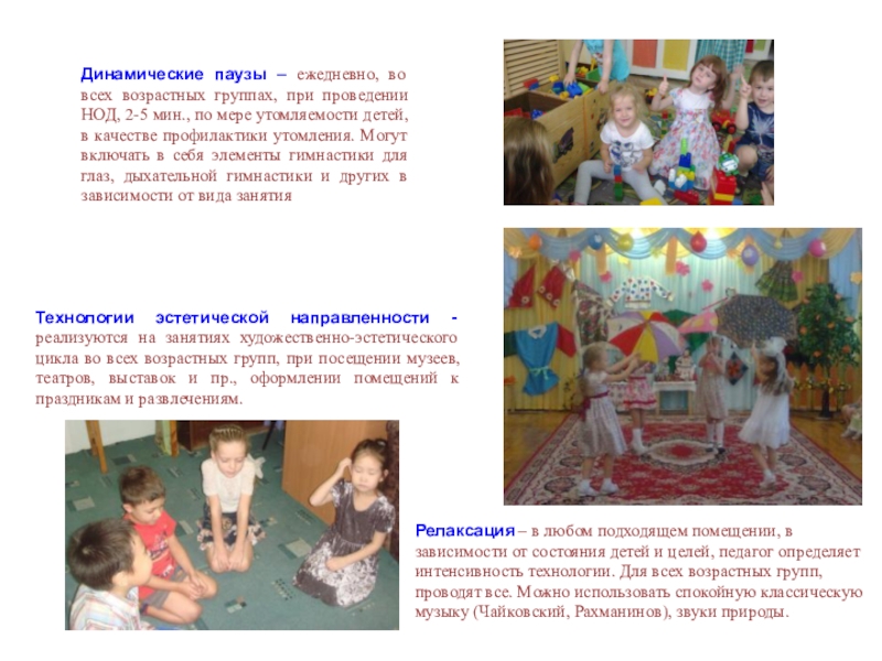 Релаксация – в любом подходящем помещении, в зависимости от состояния детей и целей, педагог определяет интенсивность технологии. Для всех возрастных групп, проводят все. Можно использовать спокойную классическую музыку (Чайковский, Рахманинов), звуки природы.