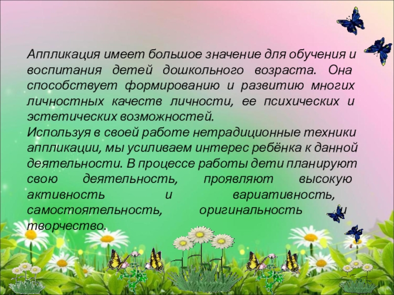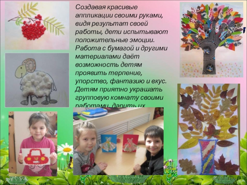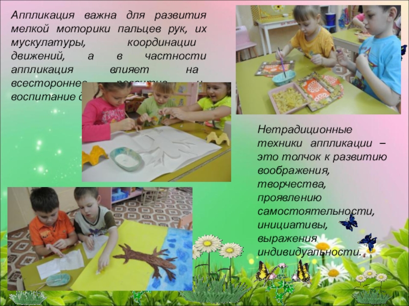 Аппликация важна для развития мелкой моторики пальцев рук, их мускулатуры, координации движений, а в частности аппликация влияет на всестороннее развитие и воспитание дошкольника.