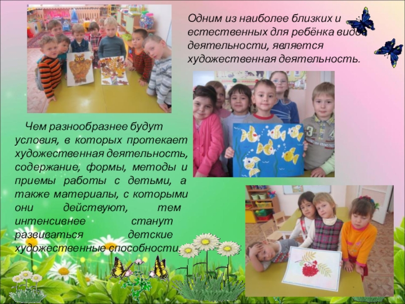 условия, в которых протекает художественная деятельность, содержание, формы, методы и приемы работы с детьми, а также материалы, с которыми они действуют, тем интенсивнее станут развиваться детские художественные способности.