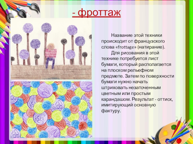 Для рисования в этой технике потребуется лист бумаги, который располагается на плоском рельефном предмете. Затем по поверхности бумаги нужно начать штриховать незаточенным цветным или простым карандашом. Результат - оттиск, имитирующий основную фактуру.