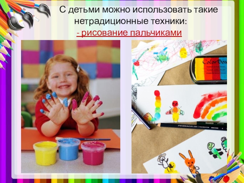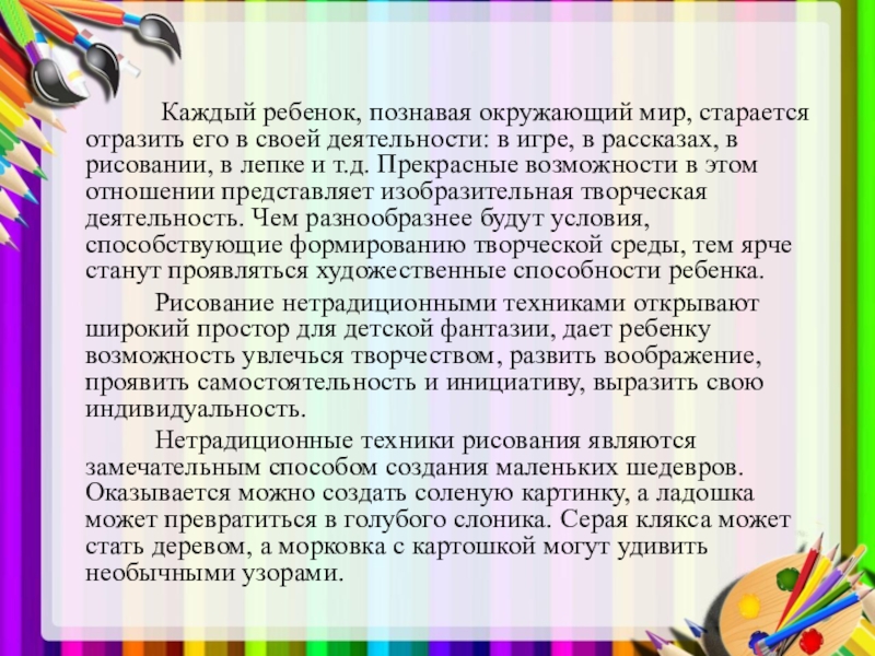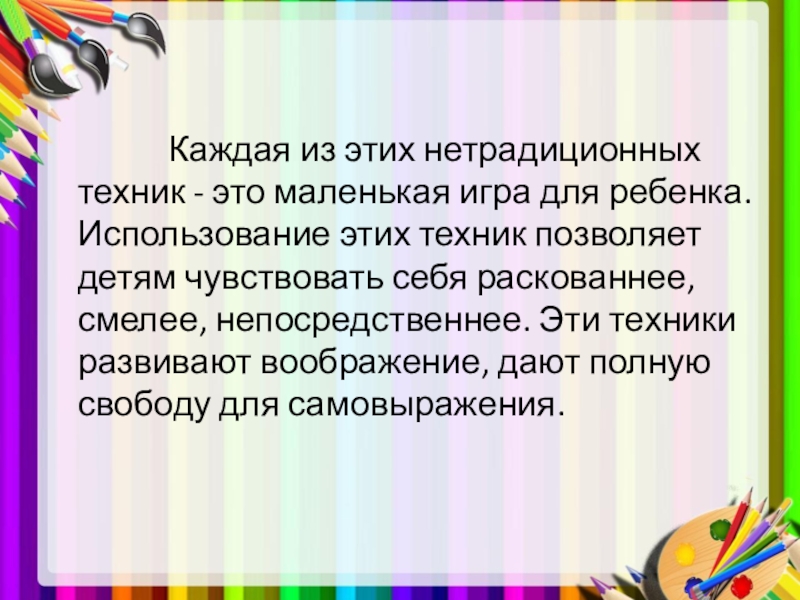 нетрадиционных техник - это маленькая игра для ребенка. Использование этих техник позволяет детям чувствовать себя раскованнее, смелее, непосредственнее. Эти техники развивают воображение, дают полную свободу для самовыражения.