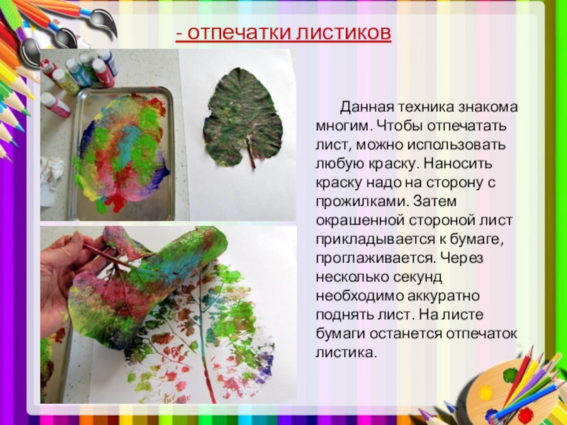 Данная техника знакома многим. Чтобы отпечатать лист, можно использовать любую краску. Наносить краску надо на сторону с прожилками. Затем окрашенной стороной лист прикладывается к бумаге, проглаживается. Через несколько секунд необходимо аккуратно поднять лист. На листе бумаги останется отпечаток листика.