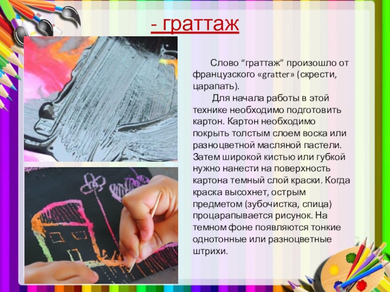 Для начала работы в этой технике необходимо подготовить картон. Картон необходимо покрыть толстым слоем воска или разноцветной масляной пастели. Затем широкой кистью или губкой нужно нанести на поверхность картона темный слой краски. Когда краска высохнет, острым предметом (зубочистка, спица) процарапывается рисунок. На темном фоне появляются тонкие однотонные или разноцветные штрихи.