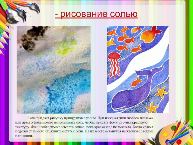 рисунку причудливые узоры. При изображении любого пейзажа или яркого фона можно использовать соль, чтобы придать фону рисунка красивую текстуру. Фон необходимо посыпать солью, пока краска еще не высохла. Когда краска подсохнет, просто стряхните остатки соли. На их месте останутся необычные светлые пятнышки.
