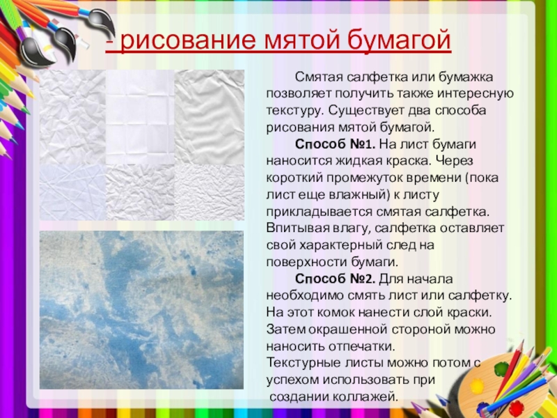 бумажка позволяет получить также интересную текстуру. Существует два способа рисования мятой бумагой.