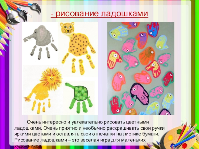 увлекательно рисовать цветными ладошками. Очень приятно и необычно раскрашивать свои ручки яркими цветами и оставлять свои отпечатки на листике бумаги. Рисование ладошками – это веселая игра для маленьких художников.