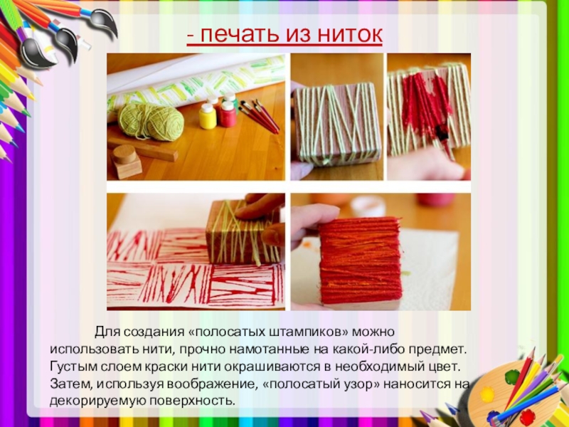 создания «полосатых штампиков» можно использовать нити, прочно намотанные на какой-либо предмет. Густым слоем краски нити окрашиваются в необходимый цвет. Затем, используя воображение, «полосатый узор» наносится на декорируемую поверхность.