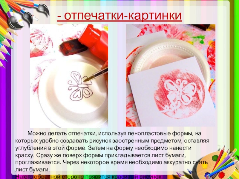 формы, на которых удобно создавать рисунок заостренным предметом, оставляя углубления в этой форме. Затем на форму необходимо нанести краску. Сразу же поверх формы прикладывается лист бумаги, проглаживается. Через некоторое время необходимо аккуратно снять лист бумаги.