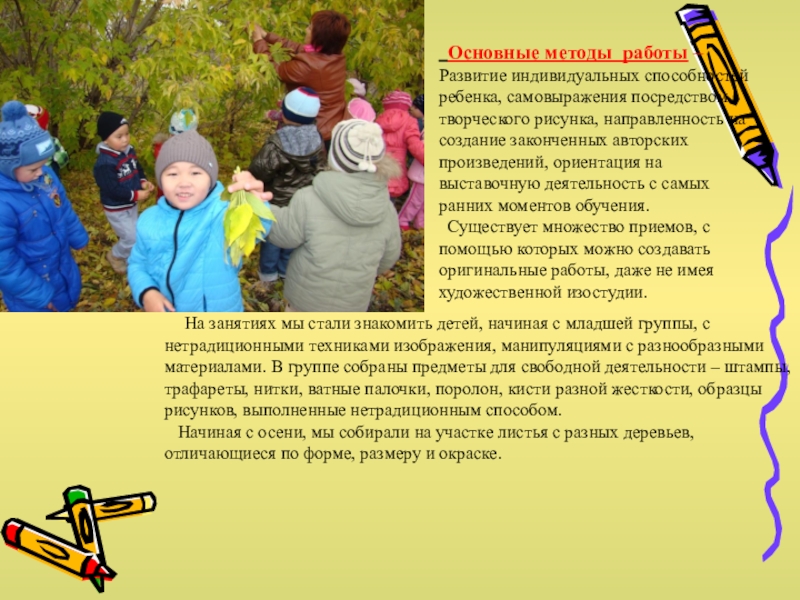 Слайд 9 Основные методы работы – Развитие индивидуальных способностей ребенка, самовыражения
