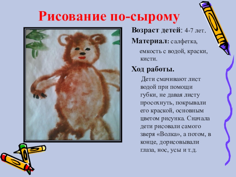 Дети смачивают лист водой при помощи губки, не давая листу просохнуть, покрывали его краской, основным цветом рисунка. Сначала дети рисовали самого зверя «Волка», а потом, в конце, дорисовывали глаза, нос, усы и т.д.