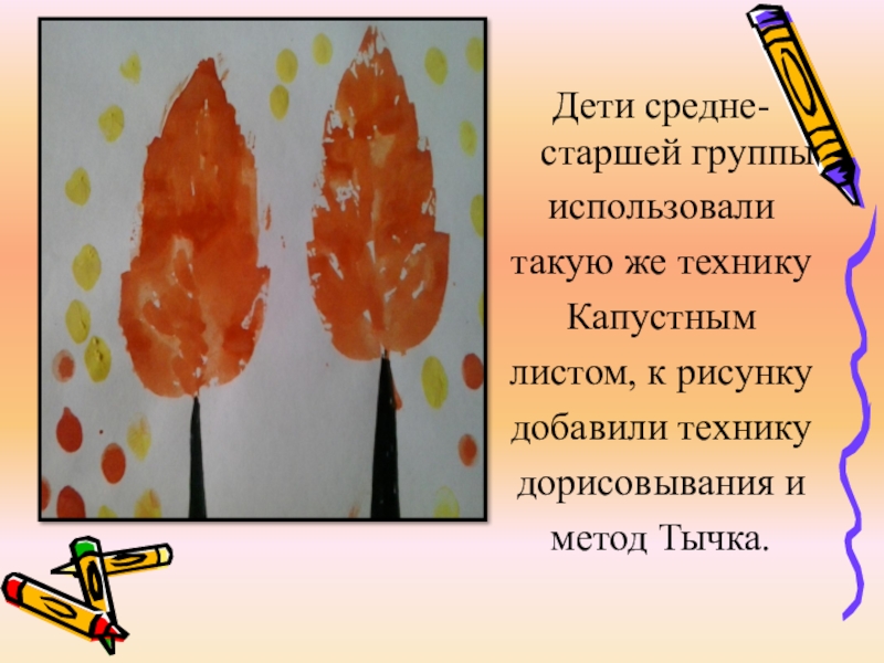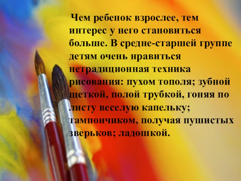 В средне-старшей группе детям очень нравиться нетрадиционная техника рисования: пухом тополя; зубной щеткой, полой трубкой, гоняя по листу веселую капельку; тампончиком, получая пушистых зверьков; ладошкой.