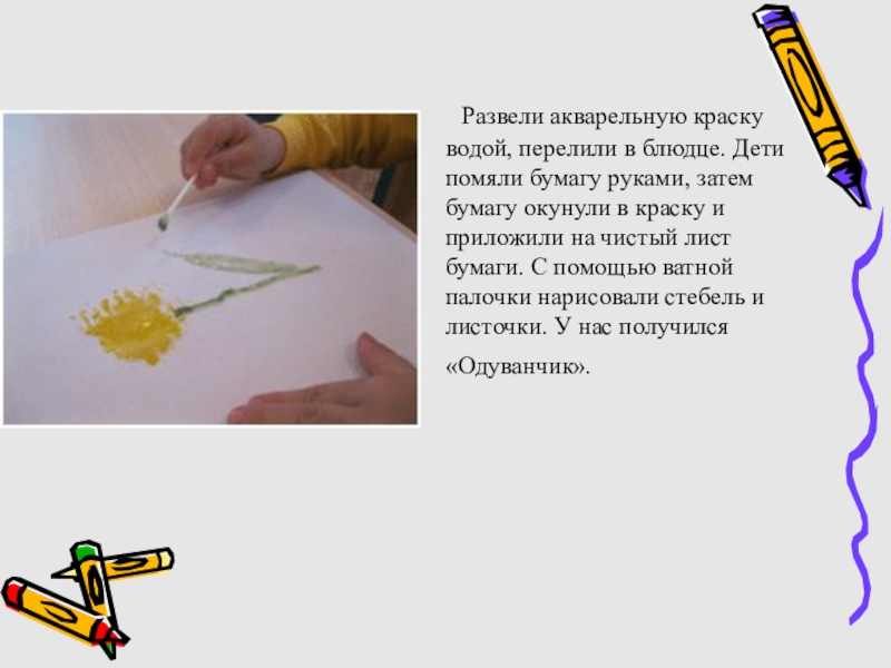 Слайд 22 Развели акварельную краску водой, перелили в блюдце. Дети