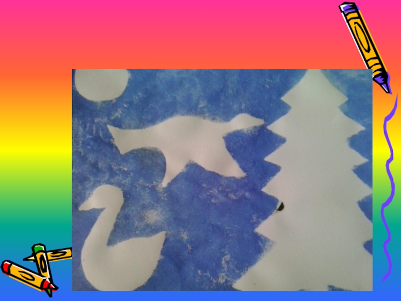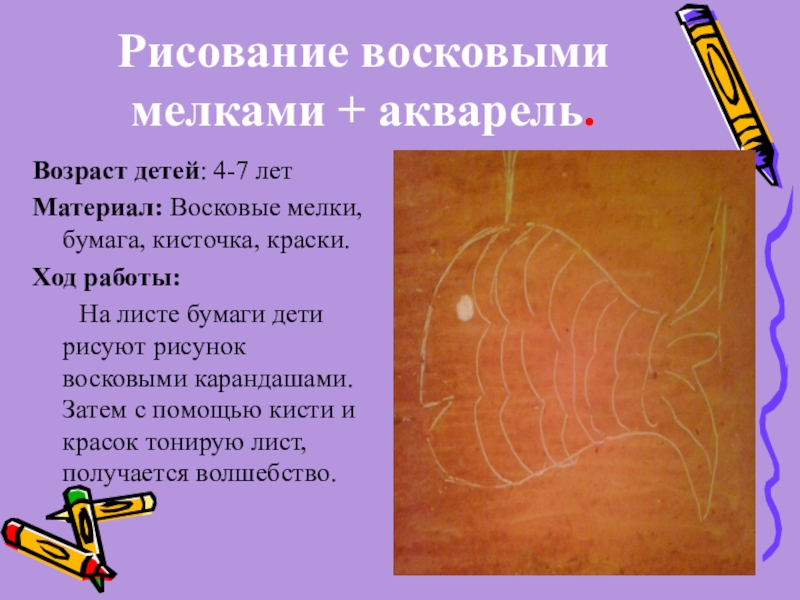 На листе бумаги дети рисуют рисунок восковыми карандашами. Затем с помощью кисти и красок тонирую лист, получается волшебство.