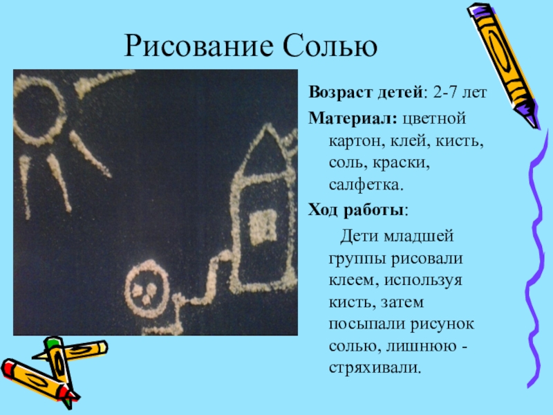 Дети младшей группы рисовали клеем, используя кисть, затем посыпали рисунок солью, лишнюю - стряхивали.