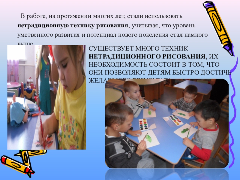 Слайд 7СУЩЕСТВУЕТ МНОГО ТЕХНИК НЕТРАДИЦИОННОГО РИСОВАНИЯ, ИХ НЕОБХОДИМОСТЬ СОСТОИТ В ТОМ, ЧТО