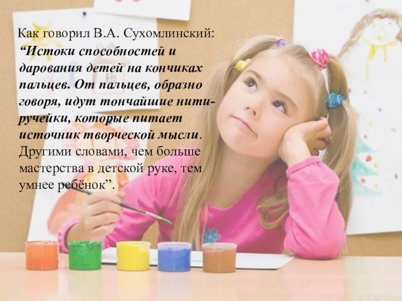 на кончиках пальцев. От пальцев, образно говоря, идут тончайшие нити-ручейки, которые питает источник творческой мысли. Другими словами, чем больше мастерства в детской руке, тем умнее ребёнок”.