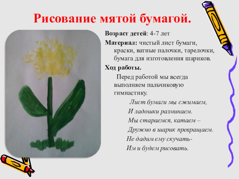 помяли бумагу руками, затем бумагу окунули в краску и приложили на чистый лист бумаги. С помощью ватной палочки нарисовали стебель и листочки. У нас получился «Одуванчик».