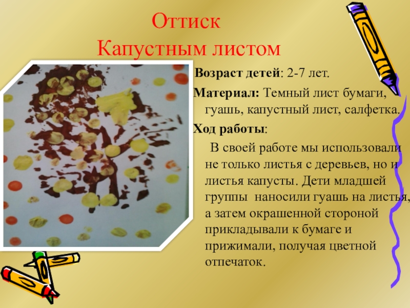 В своей работе мы использовали не только листья с деревьев, но и листья капусты. Дети младшей группы наносили гуашь на листья, а затем окрашенной стороной прикладывали к бумаге и прижимали, получая цветной отпечаток.