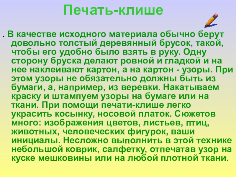 брусок, такой, чтобы его удобно было взять в руку. Одну сторону бруска делают ровной и гладкой и на нее наклеивают картон, а на картон - узоры. При этом узоры не обязательно должны быть из бумаги, а, например, из веревки. Накатываем краску и штампуем узоры на бумаге или на ткани. При помощи печати-клише легко украсить косынку, носовой платок. Сюжетов много: изображения цветов, листьев, птиц, животных, человеческих фигурок, ваши инициалы. Несложно выполнить в этой технике небольшой коврик, салфетку, отпечатав узор на куске мешковины или на любой плотной ткани.