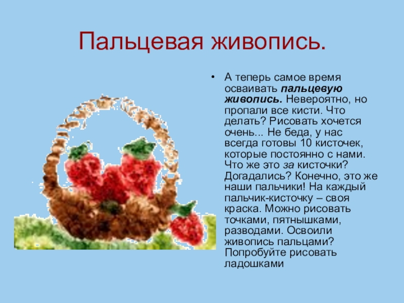 все кисти. Что делать? Рисовать хочется очень... Не беда, у нас всегда готовы 10 кисточек, которые постоянно с нами. Что же это за кисточки? Догадались? Конечно, это же наши пальчики! На каждый пальчик-кисточку – своя краска. Можно рисовать точками, пятнышками, разводами. Освоили живопись пальцами? Попробуйте рисовать ладошками