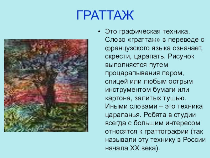 Это графическая техника. Слово «граттаж» в переводе с французского языка означает,