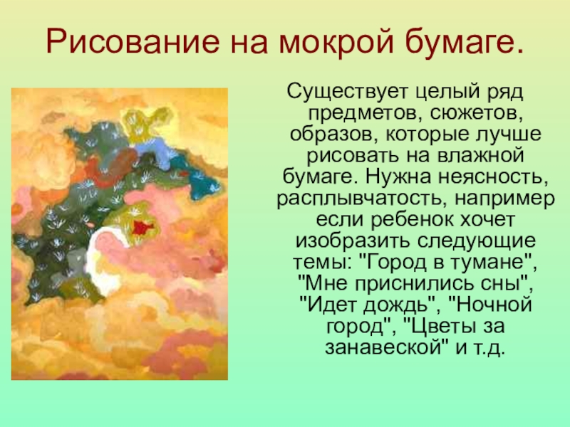 рисовать на влажной бумаге. Нужна неясность, расплывчатость, например если ребенок хочет изобразить следующие темы: "Город в тумане", "Мне приснились сны", "Идет дождь", "Ночной город", "Цветы за занавеской" и т.д.
