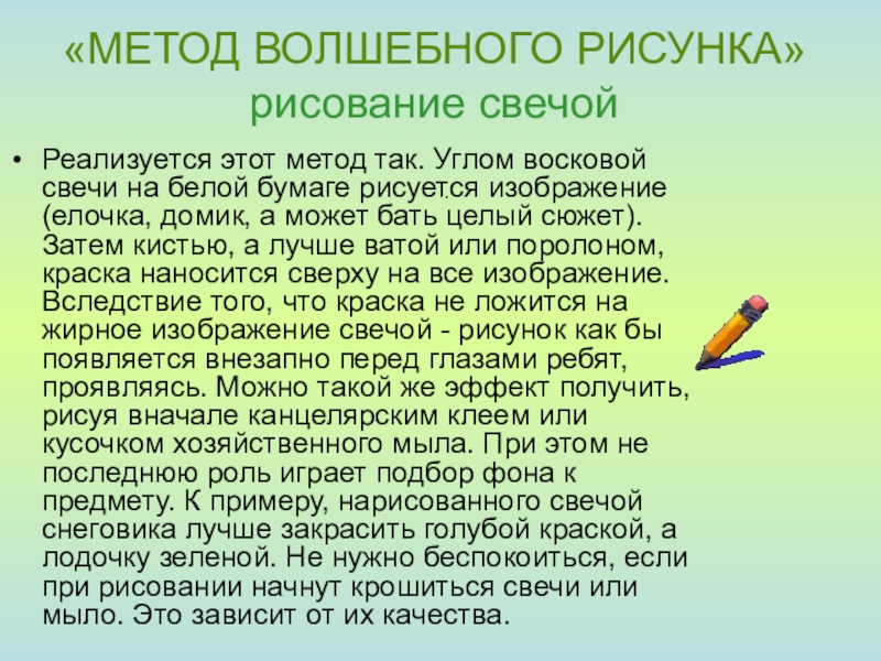 белой бумаге рисуется изображение (елочка, домик, а может бать целый сюжет). Затем кистью, а лучше ватой или поролоном, краска наносится сверху на все изображение. Вследствие того, что краска не ложится на жирное изображение свечой - рисунок как бы появляется внезапно перед глазами ребят, проявляясь. Можно такой же эффект получить, рисуя вначале канцелярским клеем или кусочком хозяйственного мыла. При этом не последнюю роль играет подбор фона к предмету. К примеру, нарисованного свечой снеговика лучше закрасить голубой краской, а лодочку зеленой. Не нужно беспокоиться, если при рисовании начнут крошиться свечи или мыло. Это зависит от их качества.