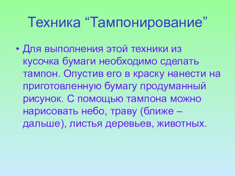 Опустив его в краску нанести на приготовленную бумагу продуманный рисунок. С помощью тампона можно нарисовать небо, траву (ближе – дальше), листья деревьев, животных.