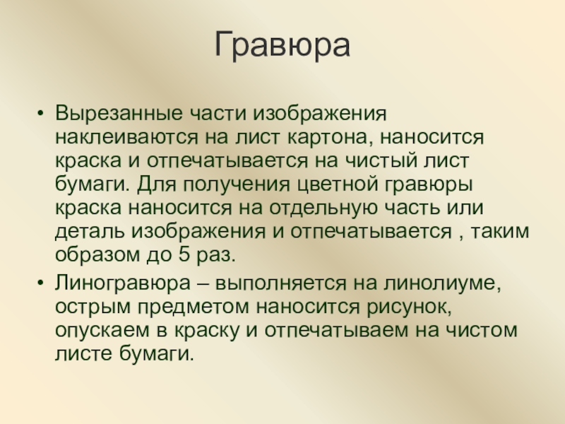 на чистый лист бумаги. Для получения цветной гравюры краска наносится на отдельную часть или деталь изображения и отпечатывается , таким образом до 5 раз.