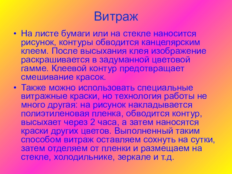 клеем. После высыхания клея изображение раскрашивается в задуманной цветовой гамме. Клеевой контур предотвращает смешивание красок.