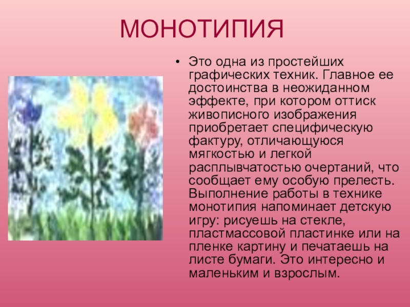 в неожиданном эффекте, при котором оттиск живописного изображения приобретает специфическую фактуру, отличающуюся мягкостью и легкой расплывчатостью очертаний, что сообщает ему особую прелесть. Выполнение работы в технике монотипия напоминает детскую игру: рисуешь на стекле, пластмассовой пластинке или на пленке картину и печатаешь на листе бумаги. Это интересно и маленьким и взрослым.
