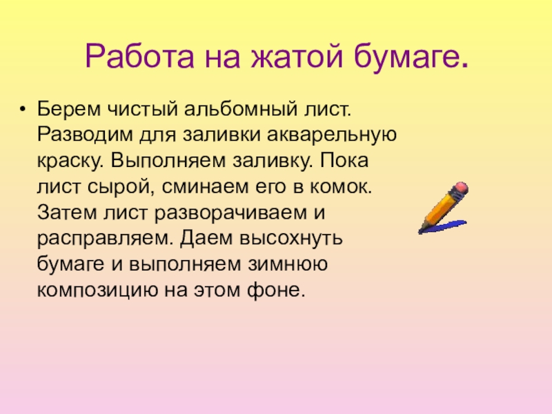 краску. Выполняем заливку. Пока лист сырой, сминаем его в комок. Затем лист разворачиваем и расправляем. Даем высохнуть бумаге и выполняем зимнюю композицию на этом фоне.
