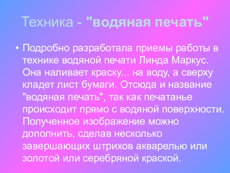 печати Линда Маркус. Она наливает краску... на воду, а сверху кладет лист бумаги. Отсюда и название "водяная печать", так как печатанье происходит прямо с водяной поверхности. Полученное изображение можно дополнить, сделав несколько завершающих штрихов акварелью или золотой или серебряной краской.