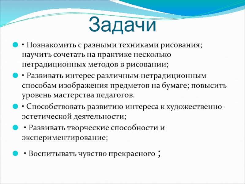 Задачи• Познакомить с разными техниками рисования; научить сочетать на практике несколько нетрадиционных методов в рисовании;• Развивать интерес