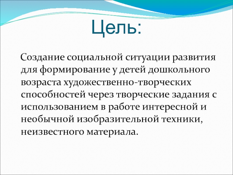 Цель:  Создание социальной ситуации развития для формирование у детей дошкольного возраста художественно-творческих способностей через творческие задания с