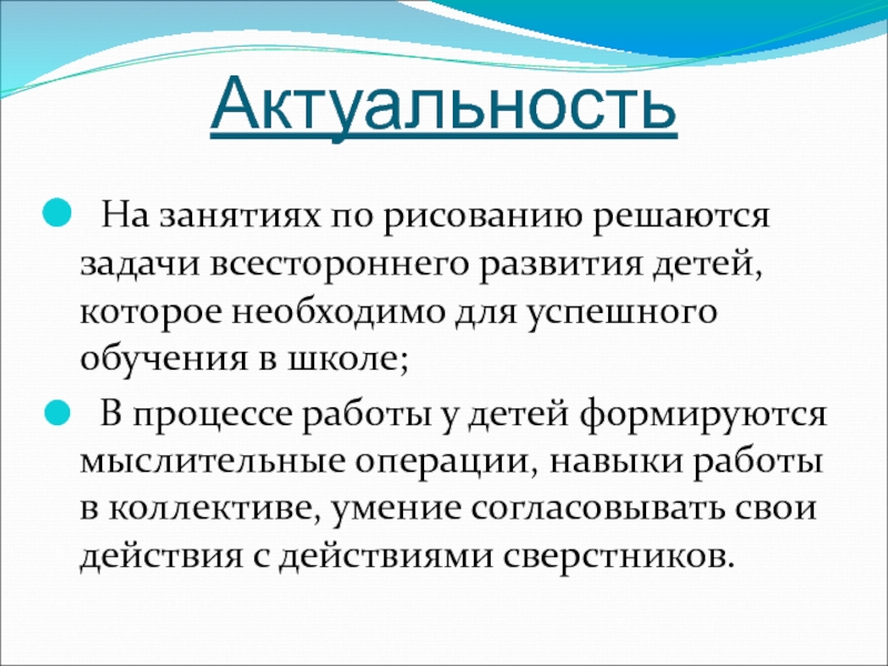 Актуальность  На занятиях по рисованию решаются задачи всестороннего развития детей, которое необходимо для успешного обучения в школе;