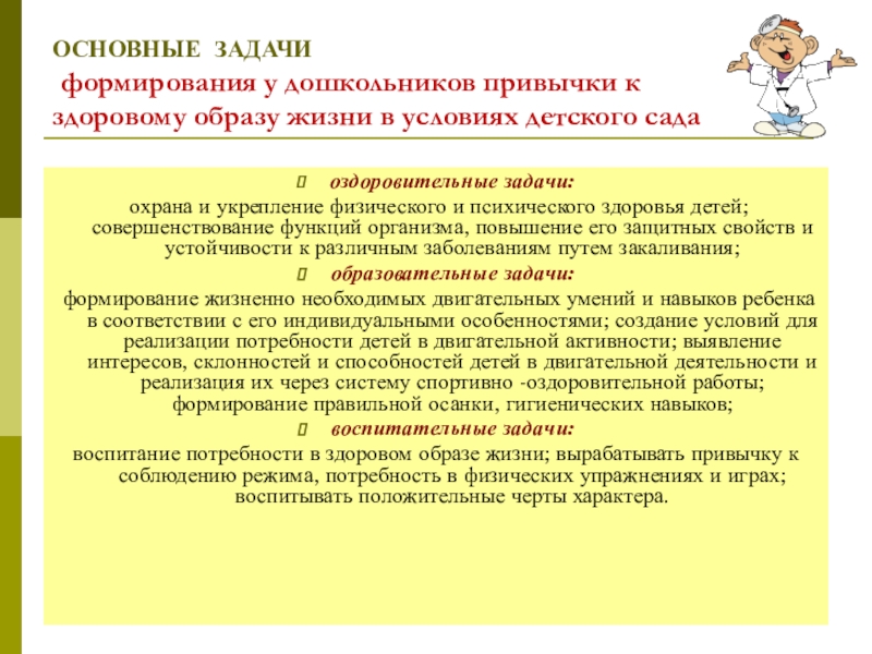 воспитание потребности в здоровом образе жизни; вырабатывать привычку к соблюдению режима, потребность в физических упражнениях и играх; воспитывать положительные черты характера.