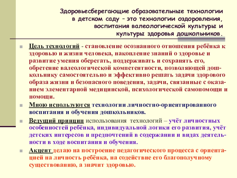 Цель технологий - становление осознанного отношения ребёнка к здоровью и жизни человека, накопление знаний о здоровье и развитие умения оберегать, поддерживать и сохранять его, обретение валеологической компетентности, позволяющей дош-кольнику самостоятельно и эффективно решать задачи здорового образа жизни и безопасного поведения, задачи, связанные с оказа-нием элементарной медицинской, психологической самопомощи и помощи.