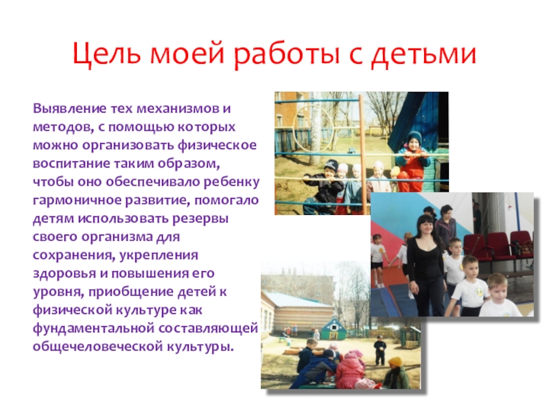 формирование жизненно необходимых двигательных умений и навыков ребенка в соответствии с его индивидуальными особенностями; создание условий для реализации потребности детей в двигательной активности; выявление интересов, склонностей и способностей детей в двигательной деятельности и реализация их через систему спортивно -оздоровительной работы; формирование правильной осанки, гигиенических навыков;